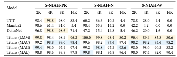 3. DeltaNet은 델타 규칙을 사용해 메모리를 지울 수 있지만, 완전한 잊기 메커니즘이 없어 메모리를 완전히 지울 수 없습니다. 반면 Titans는 Neural Memory와 잊기 메커니즘을 결합하여 더 뛰어난 성능을 보인다.
