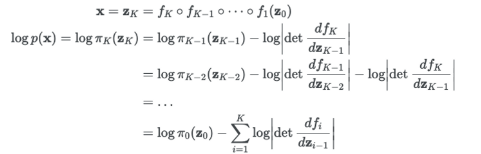 이제 이를 분포를 알고있는 z~ π(z)로부터 x의 분포를 구하는 것에 적용해보자. 변수 변환과 자코비안의 성질을 통해 아래와 같은 식을 얻을 수 있다.