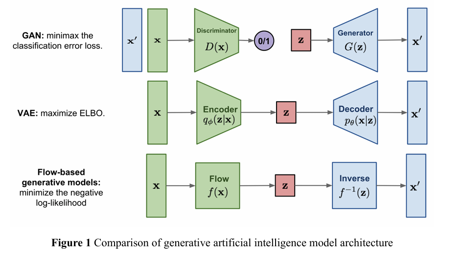 생성형 인공지능(GAI)의 핵심 원리는 기존 데이터를 학습하여 새로운 데이터 인스턴스를 생성하는 것으로 대표적인 생성 모델 아키텍처는 다음 세 가지로 구분된다.
