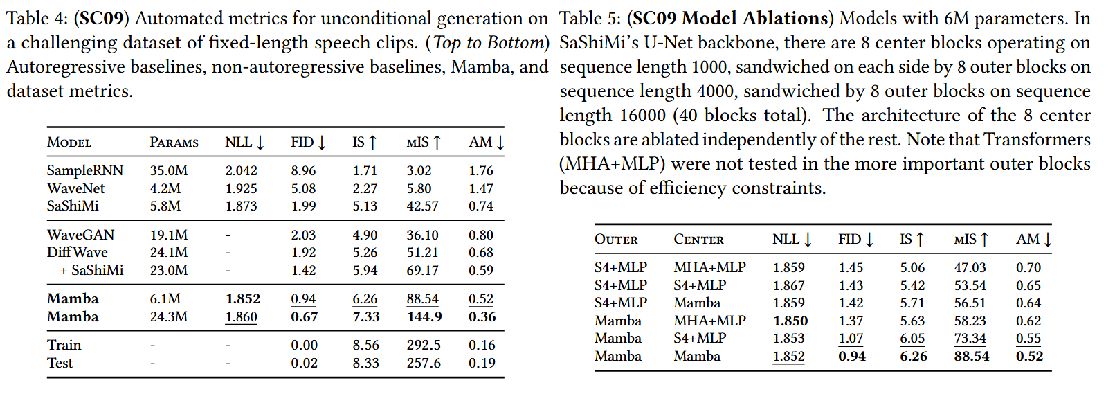 오디오 분야에서도 작은 Mamba 모델이 훨씬 큰 SOTA 모델인 GAN 또는 Diffusion 기반 모델보다 더 높은 성능을 보였다(Table 4).