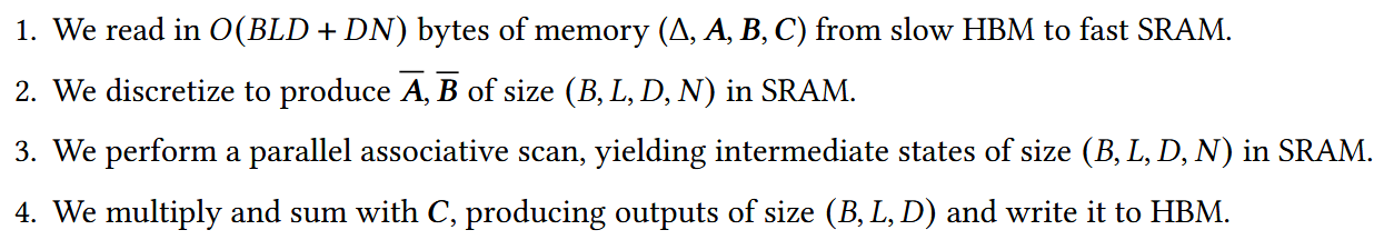이 경우에 Scan 방법을 사용하면 되지만 위 S6 알고리즘을 보면 이산화된 행렬 A, B가 (B, L, D, N) 차원으로 굉장히 메모리 소요가 크다는 것을 알 수 있다.