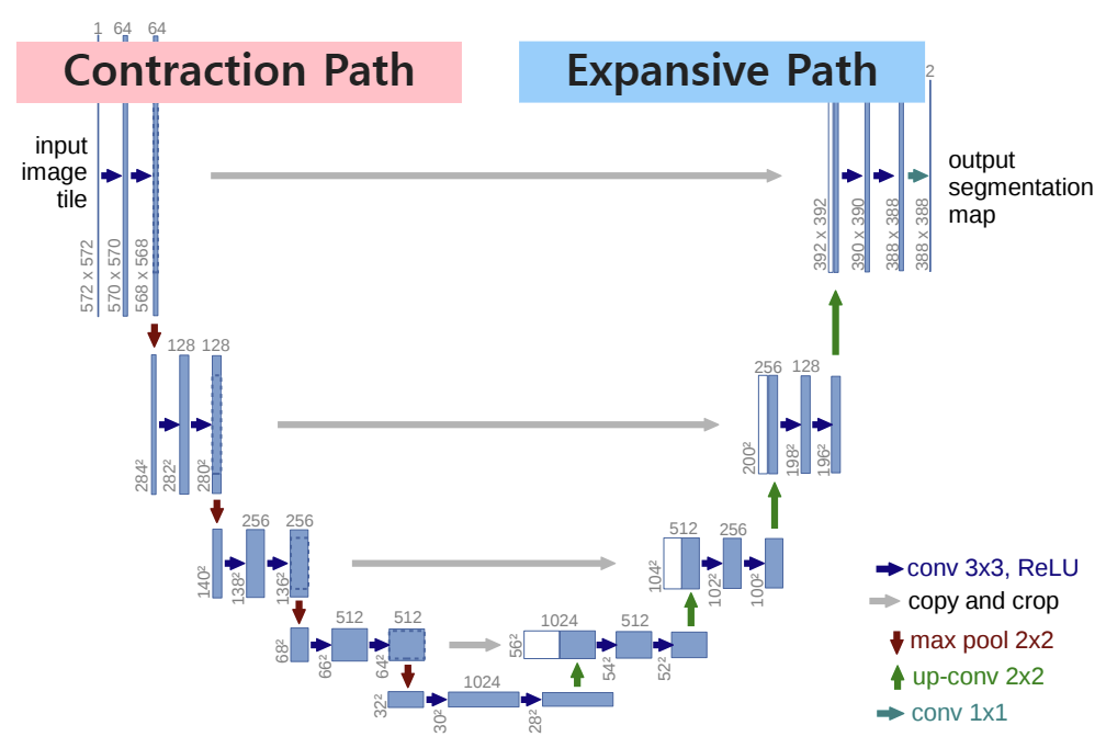 - contraction path와 expansive path 둘다 convolution 기반이며 미세한 차이를 가진 대칭적 구조 ➡️ "U-Net"이라 이름 붙임