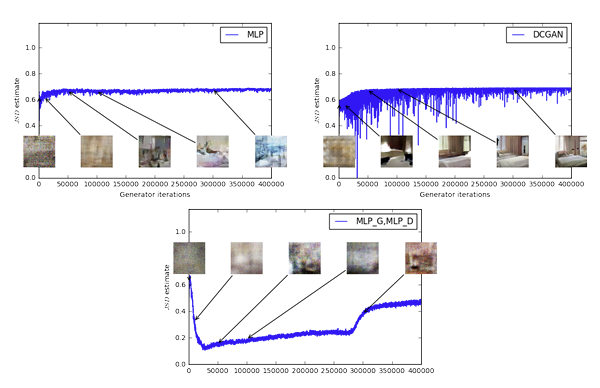 위의 그래프는 Jensen-Shannon(JS) distance를 사용하여 실험한 결과이며, 곡선이 샘플 품질과 명확한 상관관계를 가지지 않음을 보여준다. A에서 사용한 critic+MLP, critic+DCGAN, MLP+MLP 모델 구조를 동일하게 적용한 후, generator의 각 iteration 마다 JS distance를 측정하여 그래프를 확인한 결과를 보인다. 결과적으로 샘플 품질이 향상되어도 JS distance는 증가하거나 상수 값을 유지하는 것을 볼 수 있다.