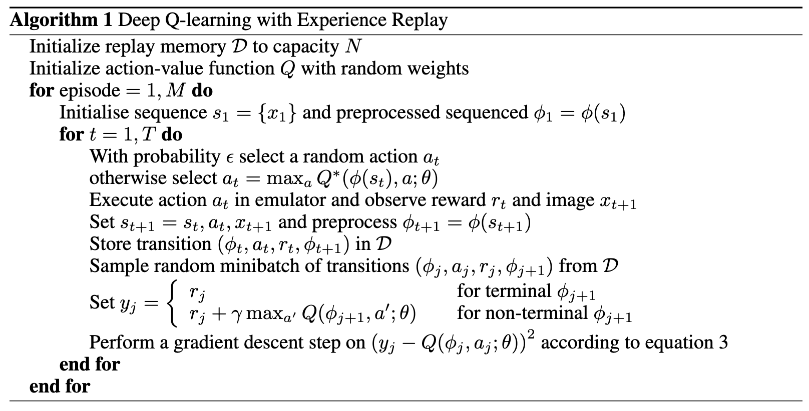1. 알고리즘의 내부 루프 동안, 저장된 샘플 풀에서 무작위로 샘플링된 경험 e∼D 에 대해 Q-러닝 업데이트 또는 미니배치(minibatch) 업데이트를 적용