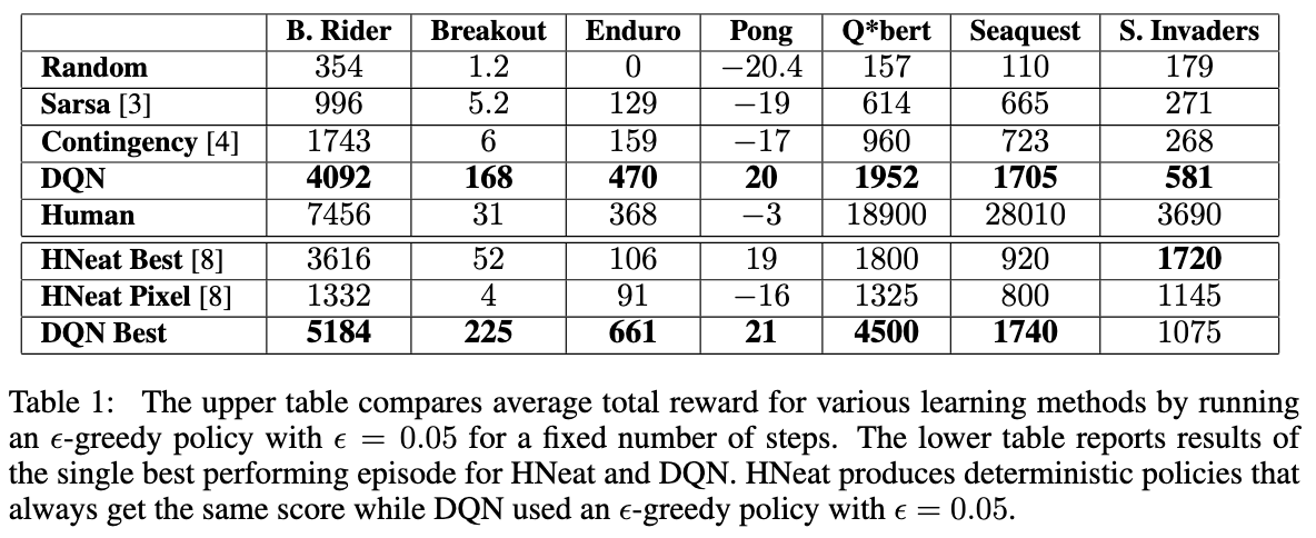 → 시도한 7개의 게임 중 6개에서 이 네트워크는 기존의 모든 RL 알고리즘을 능가했으며, 3개의 게임에서는 인간 전문가를 초월하는 성능을 기록