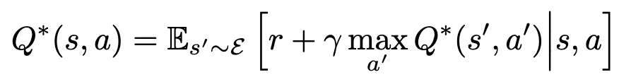 * 만약 다음 타임스텝에서 가능한 모든 행동 에 대한 시퀀스 의 최적 값 Q*(s′,a′)를 알고 있다면, 최적의 전략은 다음 값을 최대화하는 행동 a′ 를 선택하는 것