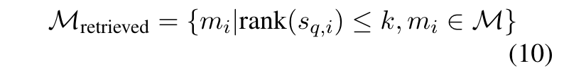 - 현재 상호작용과 관련된 정보를 효율적으로 제공하기 위해, 쿼리 임베딩 $e_q$과 모든 노트 $e_i$의 임베딩 간 유사도 $s_{q, i}$를 계산하여 상위 k개의 관련 기억 $M_{retrieved}$을 검색