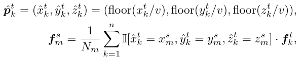- 각 복셀의 특징 벡터 fsm는 해당 복셀에 속하는 모든 포인트의 특징 벡터 fkt의 평균값으로 계산됨