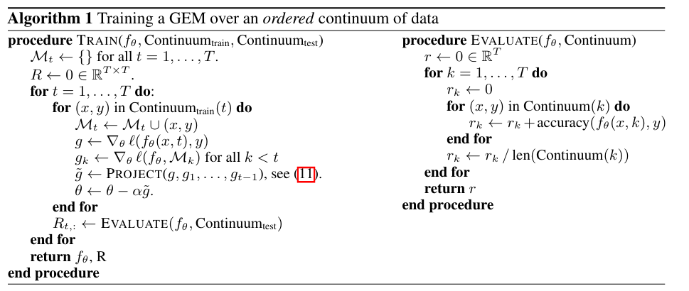 위와 같은 방식의 gradient 업데이트 방식과 위에서 정의했던 평가방식들을 이용하여 최종적으로 GEM을 이용하여 학습하는 전체 알고리즘 구조는 다음과 같다.
