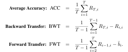 각 task에 대한 성능 평가 행렬을 R이라고 정의했을 때 다음 3개의 metrics를 정의할 수 있다.