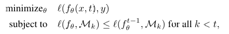 GEM은 이전 task의 loss가 증가하지 않도록 하면서 현재 task를 학습하는 방식으로 작동한다. 이때 task k에서의 loss는 다음과 같이 정의된다.