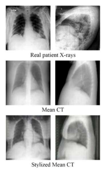 - Mean CT scan : coronal, sagittal axis 평균을 내어 2D CT scan 생성, style transfer GAN의 input이 되어 X-ray image style과 비슷하도록 변환됨 → Simulated X-ray와 CT scan의 pair 생성