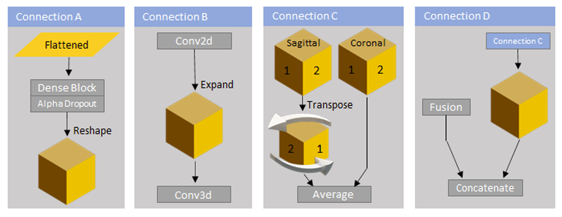 sagittal view가 front-facing coronal view와 직교하도록 조정 후 평균화하여 voxel 표현 - Connetion-D : Connection-C의 구조를 통해 도출된 average output과, fusion decoding layer에서 추가 input을 받아 concatenated