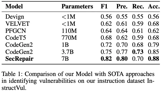 실험 결과는 비슷하거나 더 적은 매개변수를 가진 다른 모델들에 비해 SecRepair 모델의 우수성을 보여준다.