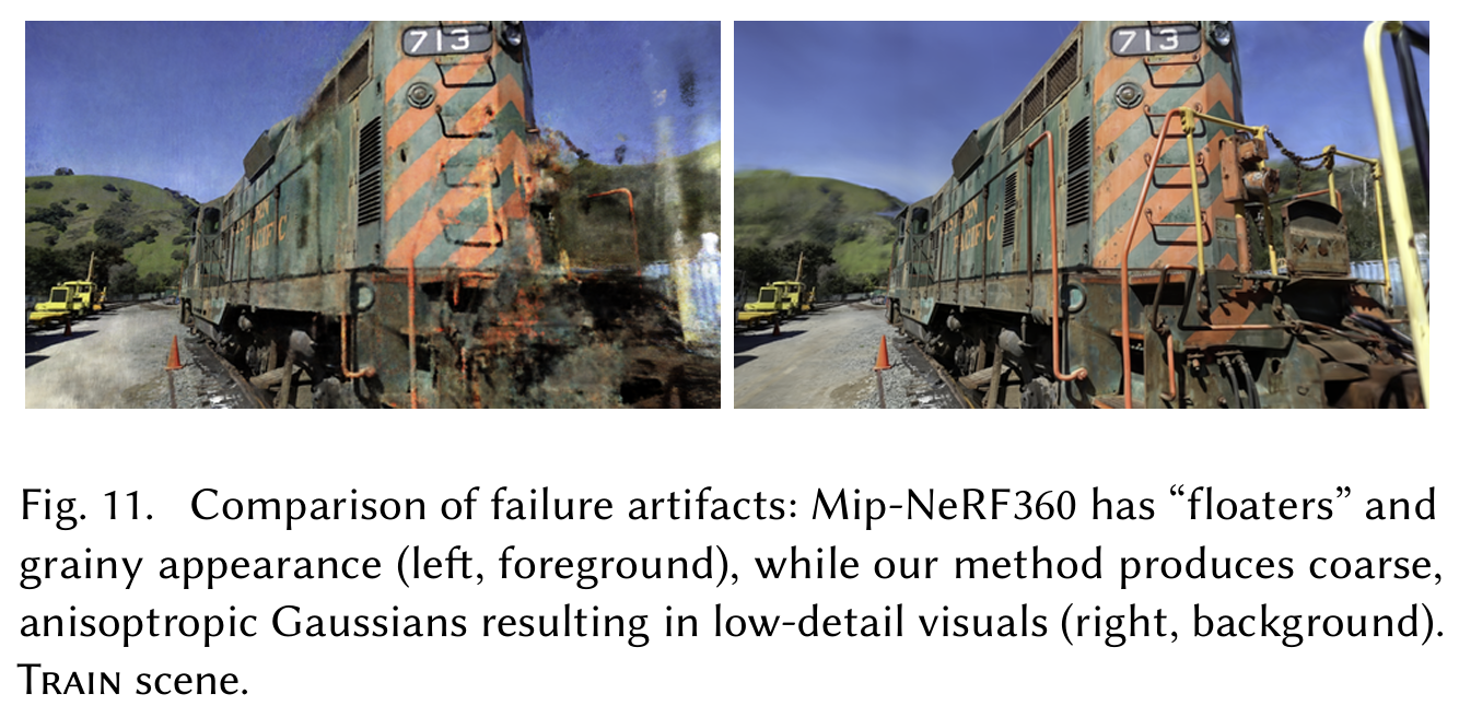- 특히 anisotropic Gaussians가 장점도 있지만, 잘못 최적화되면 늘어진(splotchy) 형태의 Gaussian이 생길 수 있음.