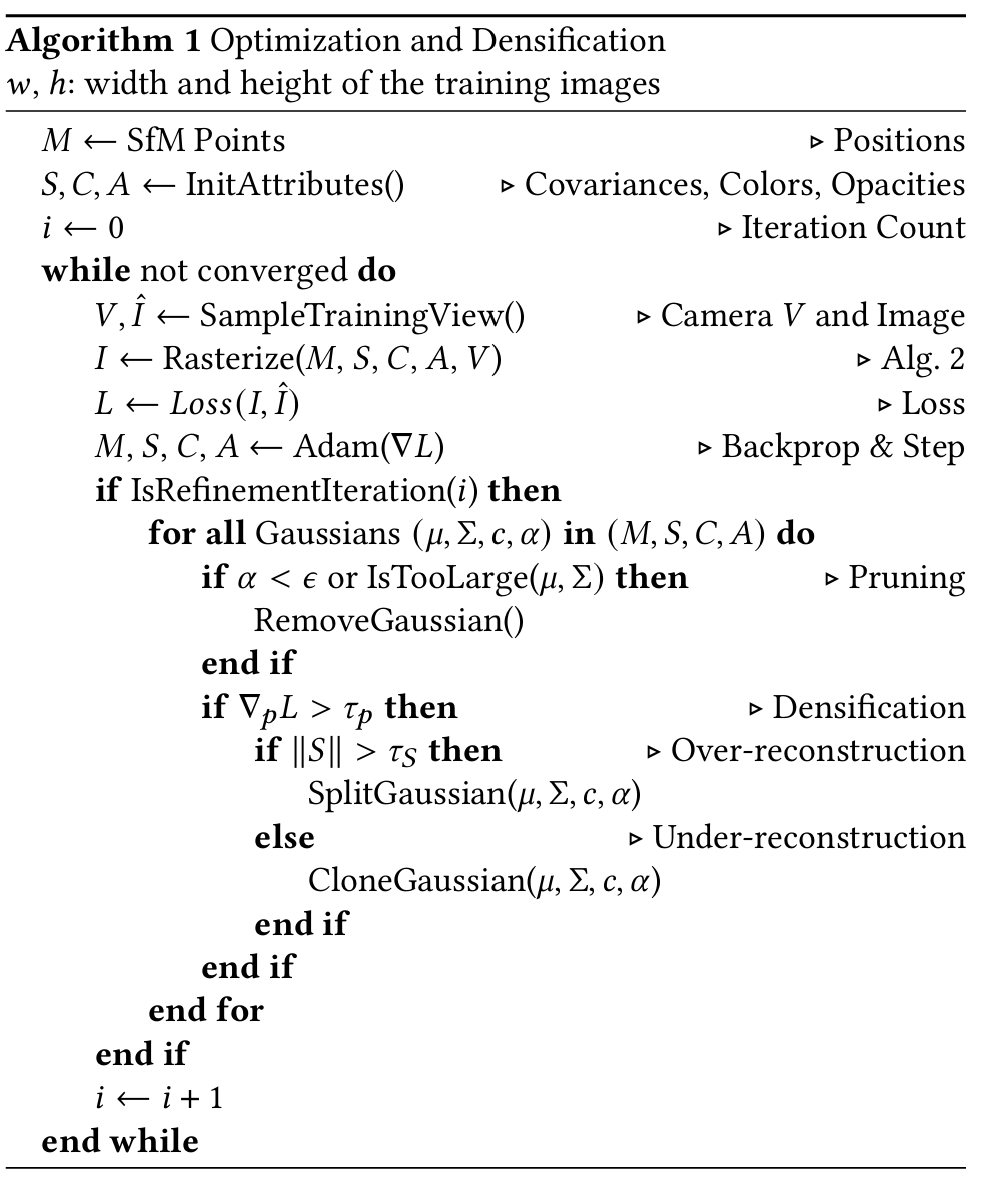 - 중간에 adaptive density control 수행 (필요시 Gaussian 추가/제거)