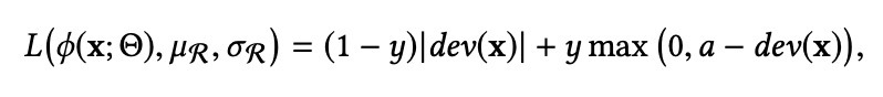 위 그림을 보면 DevNet모델은 크게 두 부분으로 구성됨을 볼 수 있다. 먼저 모든 데이터에 대해 Anomaly Score를 분석하는 부분과 Reference Score(참조 점수)를 계산하는 부분이다. 참조 점수는 정상 데이터 N 중 일부를 샘플링해 구한다. 이 후 이 두 점수를 손실 함수에 입력해 이상치를 판별한다. 자세한 내용은 이후에 나온다.