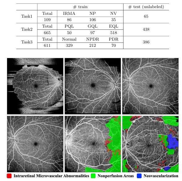 - Pixel-level lesions detection : IRMA(Intraretinal microvascular abnormality), NP(Nonperfusion areas), NV(Neovascularization)