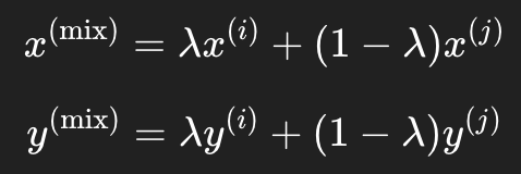 - Mixup의 기본 아이디어: 두 개의 입력 (x^(i), y^(i)), (x^(j), y^(j))