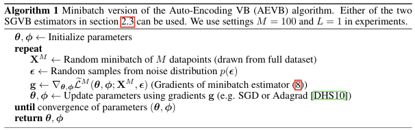 특히 이 방법은 i.i.d. (independent and identically distributed) 데이터셋에서, 각 데이터포인트가 자기만의 연속적인 latent variable을 가진다는 설정 아래 강력한 효율성을 보인다. 이를 기반으로 본 논문은 AEVB (Auto-Encoding Variational Bayes) 알고리즘을 제안한다.