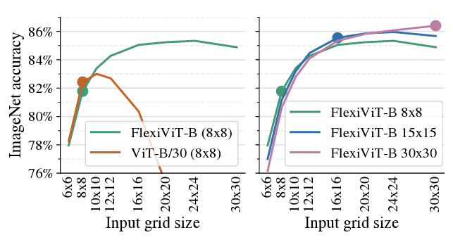 ViT-B/16 및 ViT-B/30에 비해 FlexiViT-B의 우수한 성능 : Trained patch에서 동일한 성능 + 다른 patch size에서 성능 우수