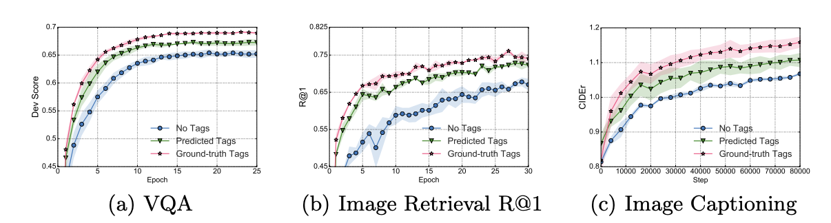 - 객체 태그를 활용한 미세 조정 학습 곡선이 태그 없이 수행한 VLP 방법보다 모든 과제에서 훨씬 빠르고 더 좋은 성능