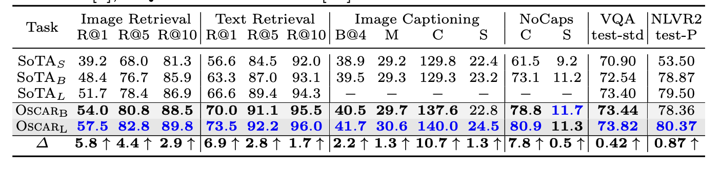 - 학습 샘플(tuple): 단어 시퀀스(word sequence), 객체 태그 집합(set of object tags), 이미지 영역 특징 집합(set of image region features)
