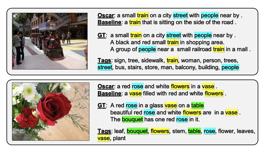 - OscarVG: Visual Genome(VG) 데이터셋으로 학습된 객체 탐지기가 생성한 객체 태그