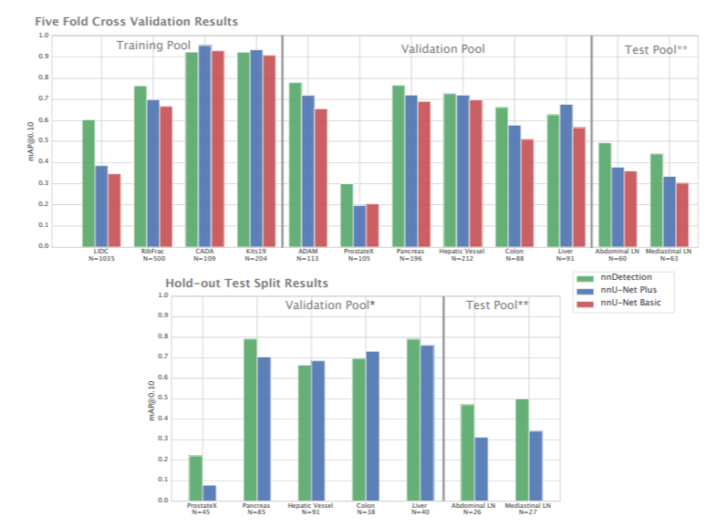 - 10개는 nnDetection 개발 및 검증에 사용 : Training pool (CADA, LIDC-IDRI, RibFrac, Kits19), Validation pool (ProstateX, ADAM, MSD Liver, Pancreas, Hepatic Vessel, Colon)