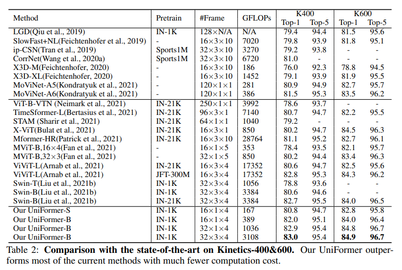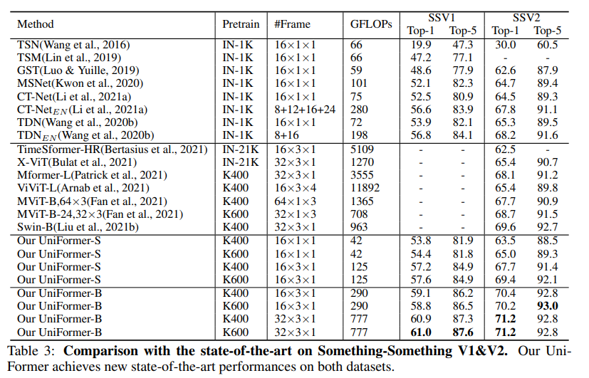 UNIFORMER는 다른 모델에 비해 10배 작은 GFLOPs만을 사용하였고 Something-Something V1/V2 데이터셋에선 SOTA를 달성하였다.
