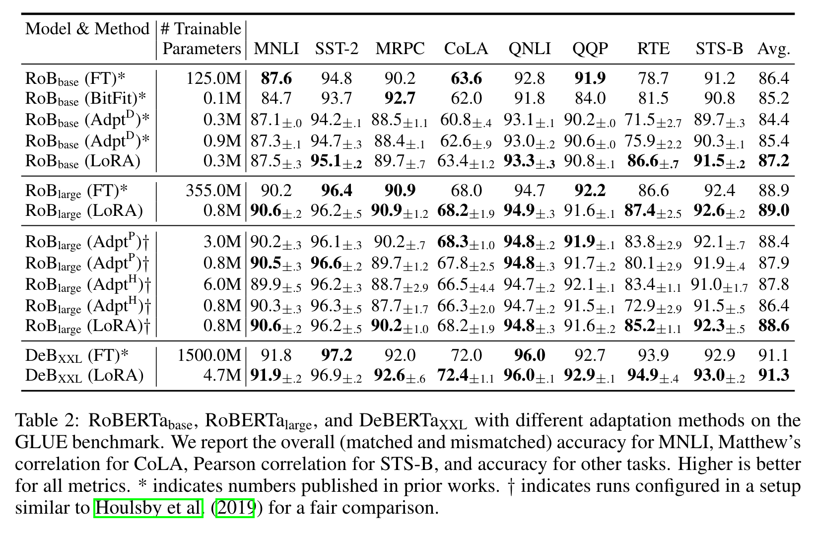 * 표시는 이전 연구의 방법론을 의미하며, † 표시는 공정한 비교를 위해 Parameter-Efficient Transfer Learning for NLP, Houlsby etal., (2019)의 설정을 따라 실험한 결과를 나타낸다.