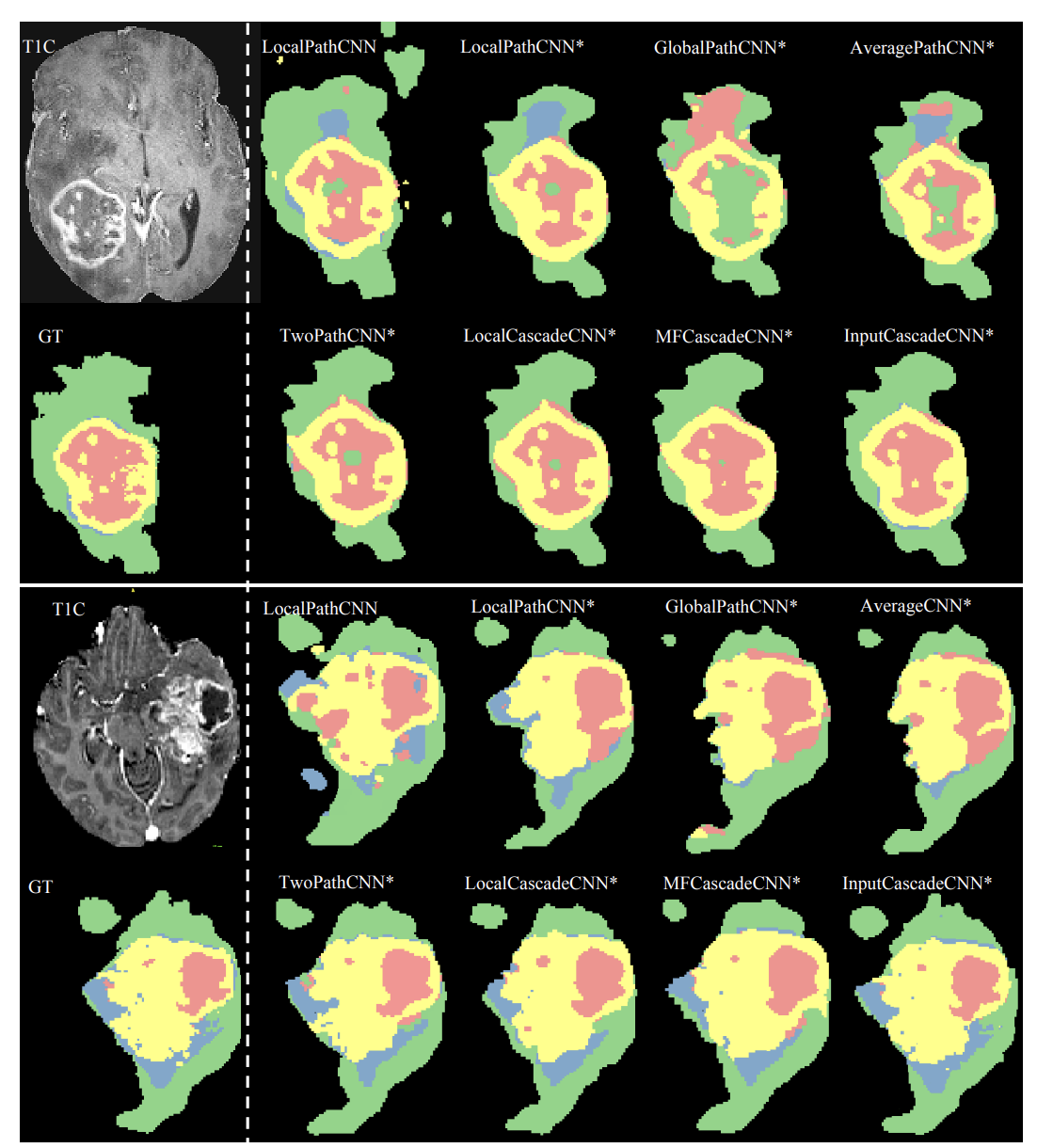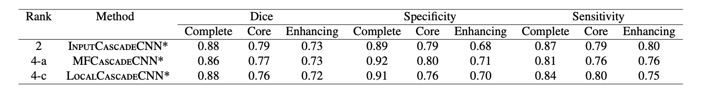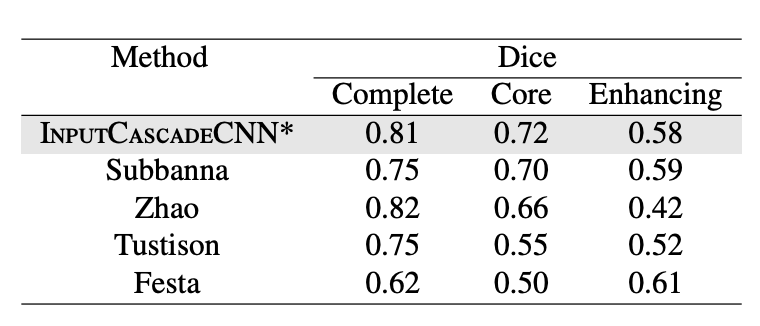 - InputCascadeCNN: 가장 좋은 성능. (Dice 측정을 개선)