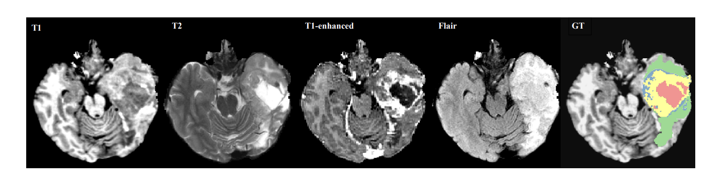 - 5개의 분할 레이블(비종양, 괴사(빨강), 부종(초록) , 비대조 종양(파랑), 대조 종양(노랑))