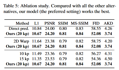 - Direct pred. vs. 2 step pred : 본 논문에서는 Canonical Keypoint를 예측하고 $R, t, \delta$를 예측하는 2 step pred를 진행했는데 네트워크가 바로 최종 Keypoint를 예측하고 Head pose loss와 Deformation Loss가 없는 Direct Keypoint Prediction은 사용자가 고개방향을 제어할 수 없다는 치명적인 단점이 있다. 2 Step Pred는 사용자가 고개 방향을 가능하게하고 성능까지 더 우수하다.