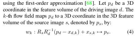 - 각 Keypoints 쌍에대해 Source Keypoints에서 Driving Keypoints으로의 움직임을 표현하는 3D Warping Flowmap $w_k$를 계산. → First Order Approximation을 사용하여 구할 수 있다. (자세한 수식은 First Order Motion Model for Image Animation (Siarohin et al.) 논문 참고)