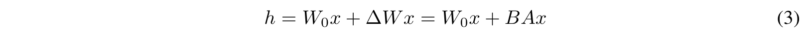 신경망의 많은 레이어들은 행렬곱으로 이루어져 있는데, 대부분의 가중치 레이어들은 full-rank이다. 기존의 연구에서 밝힌 바로는, 모든 사전 학습된 언어 모델은 low intrinsic rank를 가질 수 있다. 예를 들어, 기존 모델의 가중치 매트릭스가 크기를 가질 때, 이를 매트릭스 B와 매트릭스 A로 나타낼 수 있다( 보다 작은 차원). 기존의 파라미터 업데이트 과정과, A & B 매트릭스를 이용한 foward pass 과정을 수식으로 나타내면 식(3)과 같다.