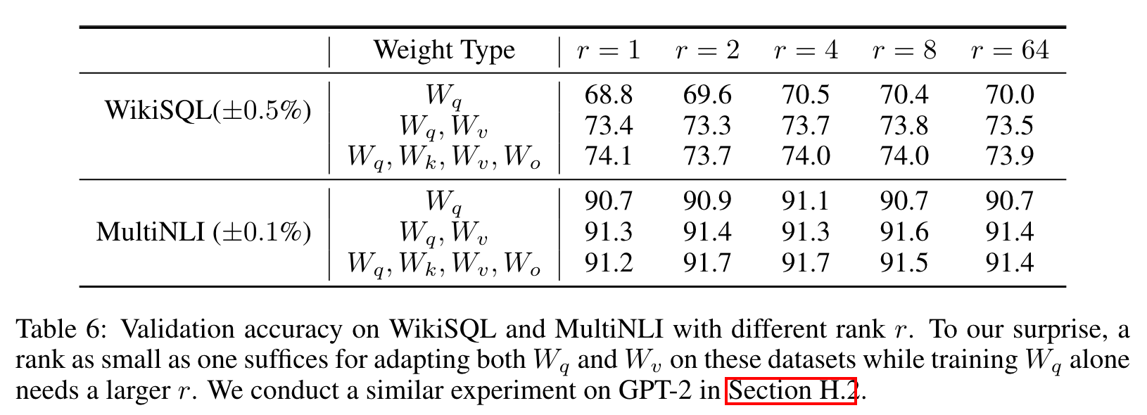 결과를 살펴보면, , 두 가중치 파라미터에 LoRA를 적용하는 것이 업데이트하는 가중치의 종류를 최대한 적게 가지면서 좋은 성능을 냈다. 이를 통해 알 수 있는 것은 rank를 4로 해도 충분히 의 정보를 담을 수 있다는 것이다