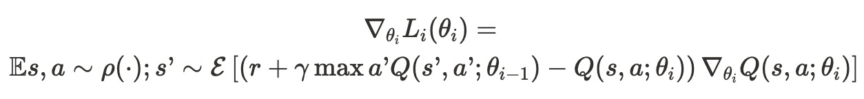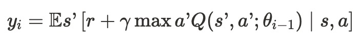 - 타깃값 yi는 현재 보상과 이전 Q Network가 예측한 미래 가치를 합쳐서 만들게 된다. 즉 Q Network에서는 타깃값이 고정되어있지 않다.