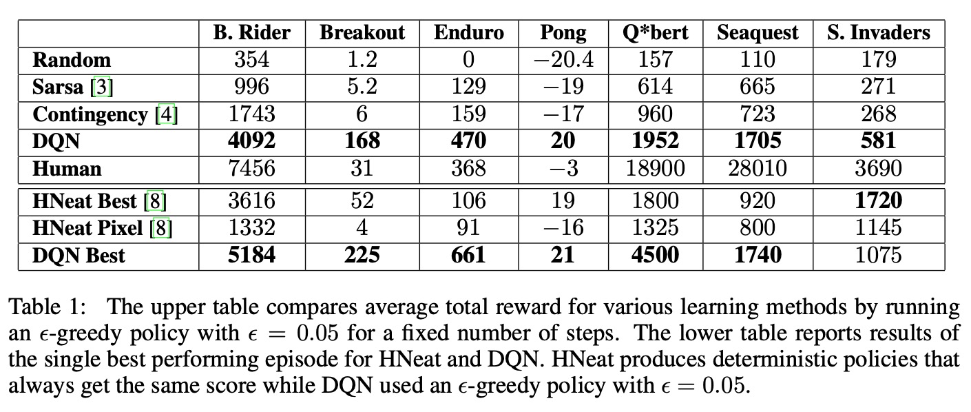 - 7가지의 아타리 게임을 대상으로 실험을 수행했고 모두 동일한 네트워크 구조, 학습 알고리즘, 파라미터 설정을 적용했다.