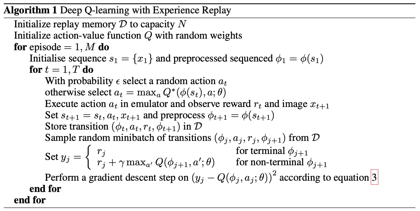- 이와는 다르게 본 연구에서는 Experience Replay라는 방식을 사용한다. 이 방식은 에이전트의 경험을 데이터셋 D에 저장한다.