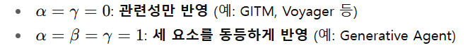 • Generative Agent: 이름, 목표, 관계 등 수동 정의
