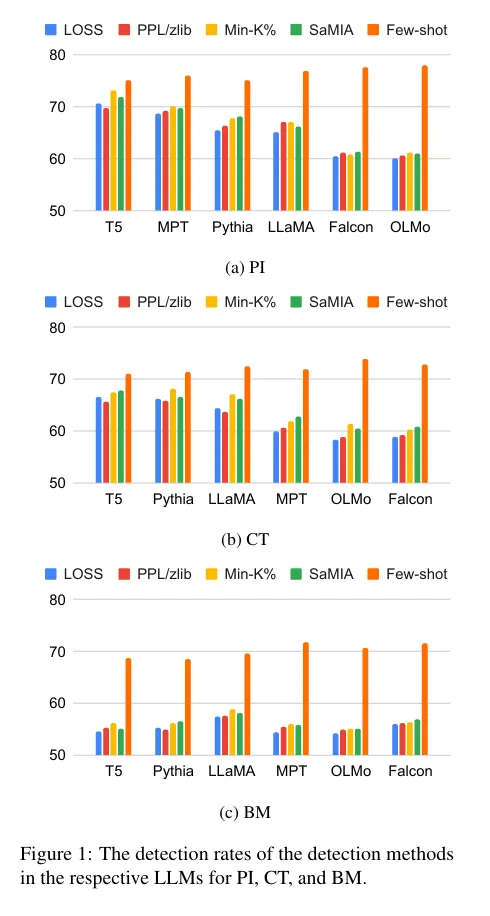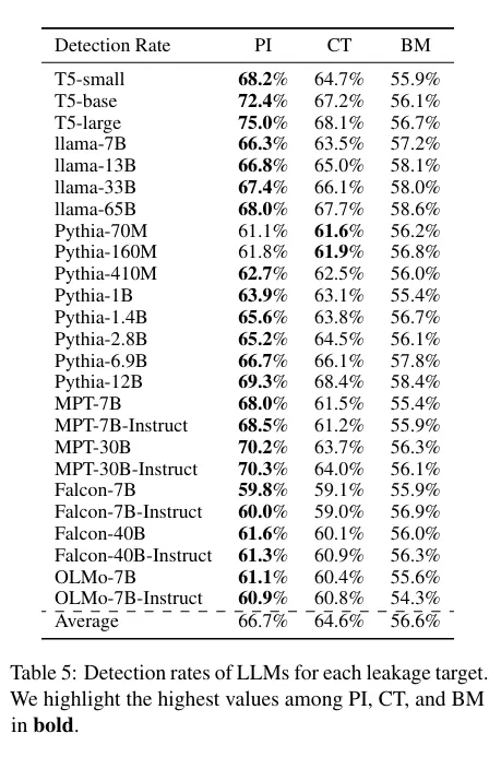 - 본 논문에서는 각각의 LLM에 포함된 사전 학습 데이터를 바탕으로 PI, CT, BM 데이터의 누출율을 측정함