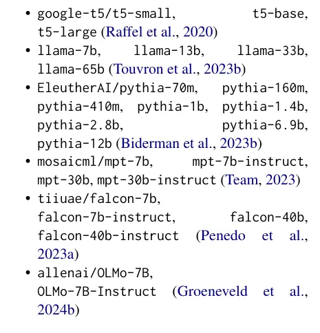 25 models as LLM (T5, LLaMa, Pythia, MPT, Falcon, OLMo…)