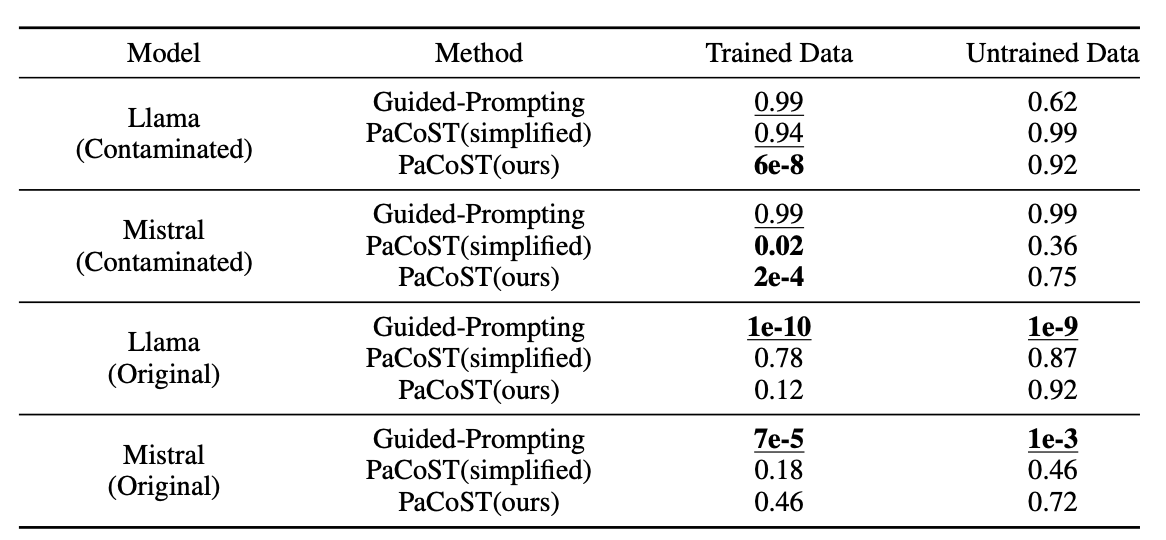 - 추가로, DCQ, Min-k% Prob의 성능도 측정했으나 벤치마크 오염 탐지에 잘 작동하지 않았음.