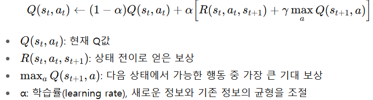 이를 Q-Learning에 적용하면 Q값 업데이트 식은 다음과 같다: