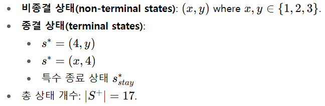 각 상태(state)는 s=(x,y)s = (x,y)로 표시되며, 좌상단은 (1,1), 우하단은 (4,4)이다.