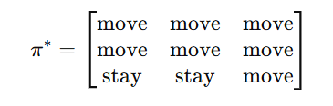즉, 대부분의 상태에서는 move가 최적 행동이지만, 용암 지역으로 떨어질 위험이 큰 일부 상태에서는 stay가 더 나은 선택이 된다.