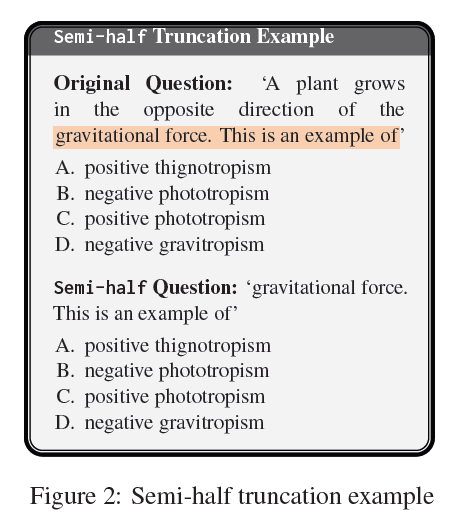 - Semi-half: 질문의 절반을 잘라내고, 여전히 정확한 답을 맞출 수 있는지 확인합니다.