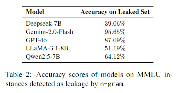 Table 2 자세히 설명Table 2는 데이터 누출이 감지된 MMLU 인스턴스에 대해 모델들의 정확도를 비교한 표입니다. 이 표는 각 모델이 누출된 데이터에서 얼마나 정확한 답을 제공하는지를 평가합니다.주요 내용:
