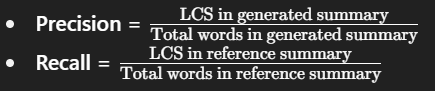 ROUGE-L 계산 방법ROUGE-L 점수는 정밀도와 재현율을 계산한 후, 이를 F1-score로 합산하는 방식입니다.
